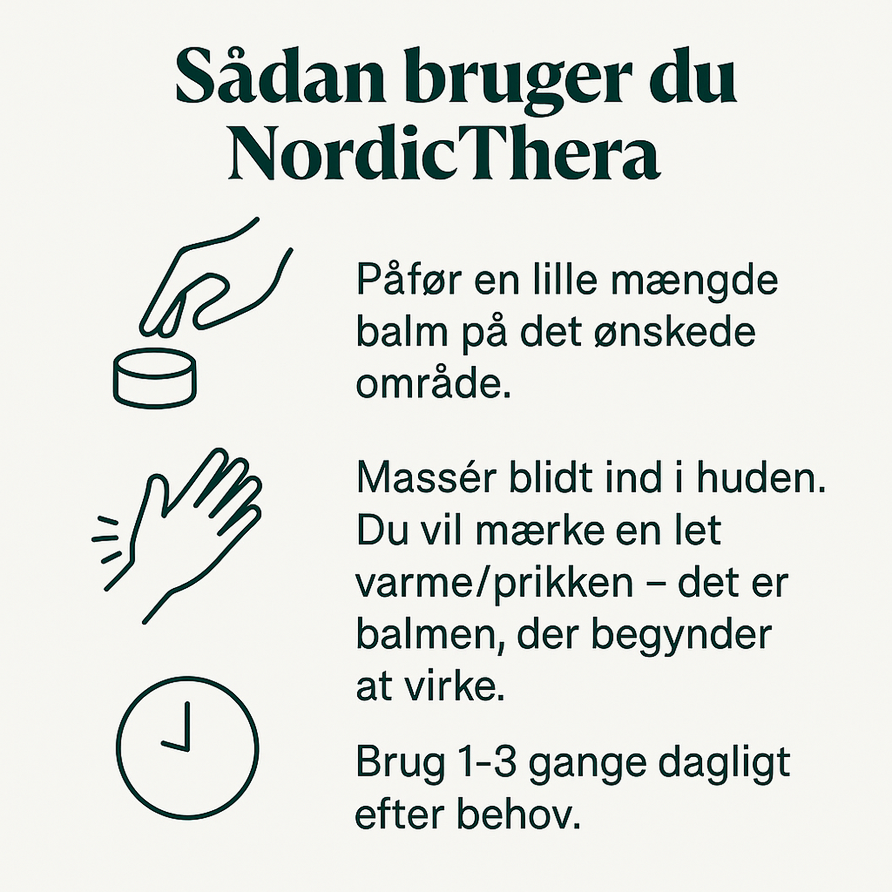 Ved regelmæssig brug kan NordicThera bidrage til øget bevægelighed, mindre ubehag og en følelse af lethed i kroppen. Cremen er skånsom nok til daglig brug og giver mærkbare resultater allerede efter få påføringer.
